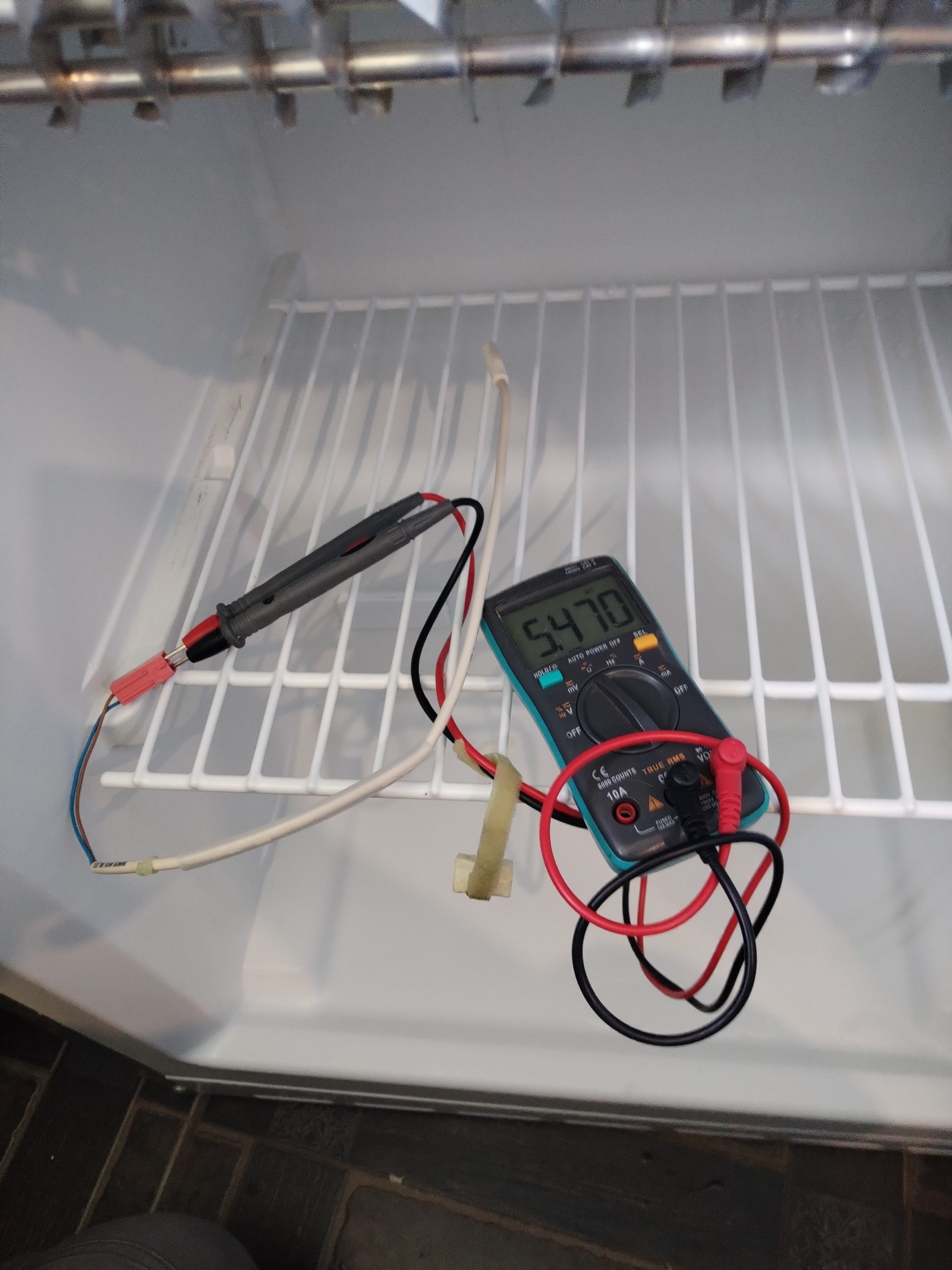 Как проверить ТПП (термоплавкий предохранитель)?Он защищает ваш холодильник, если вдруг залипли контакты реле или датчик неправильно определяет сопротивление. В общем, предохранитель разомкнёт цепь при 70–75°C. Проверить его просто: ставим мультиметр в режим прозвонки. Если запищал и показывает 1, то он целый. Если нет — меняем. Но и датчик температуры тоже меняем, потому что если бы всё было исправно, он остался бы целый. Поэтому всё это проделываем только из личного любопытства.